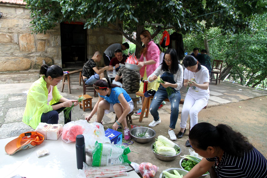 這處清幽潔凈的農家小院成了隊員大展廚藝的用武之地,大家迅速整理好自帶的蔬菜食物,按各自特長分好工。有清理蔬菜的、有和面的、有刷鍋燒水的,那些實在幫不上忙的便湊到一起圍坐在院中的樹蔭下開始“摜蛋”比賽。廚房中,面對農戶家中的那兩口大草鍋,負責炒菜的隊員直撓頭,因為在城里實在是無處尋覓這樣的鍋灶了,更不知該如何才能把這灶火燒得旺旺的。這時我們的女隊員劉惠自告奮勇,勇敢地擔起了“伙頭軍”的重任。還別說,在經過戶主老大爺的一番指點后,一會兒功夫這灶火便被她燒得有規有距起來。很快,灶房便飄出了炒肉、煎蛋的香味。此時,院中也已擺起了包旱餃的陣式來了。面已和好,兩種口味的餡料也已備好。有負責搟餃子皮的,有負責包餃子的,隊員們賽速度、賽質量,兩種口味的餃子被分別擺放在各自的簸箕里。看著形態各異的餃子,大家忍不住評價起來,最終有隊員被冠上了“專業面點師”的雅號。人多力量大,當所有的菜肴、面點擺到長桌上時,大家開心不已,雖然這算不上美味佳肴,但自己的勞動果實卻總是最美味。