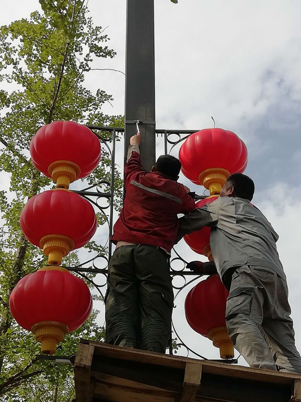 施工現(xiàn)場,大家配合默契利用小型叉車進行輔助拆除作業(yè),五分鐘不用一個燈籠就拆除完成。這邊完成拆除部分,那邊負責還原以及運送回收。由于燈籠的不可收攏性,同時為避免造成二次污染,對于拆下來的燈籠及時進行運送和回收保存,確保第二年要安裝的時候重復利用。